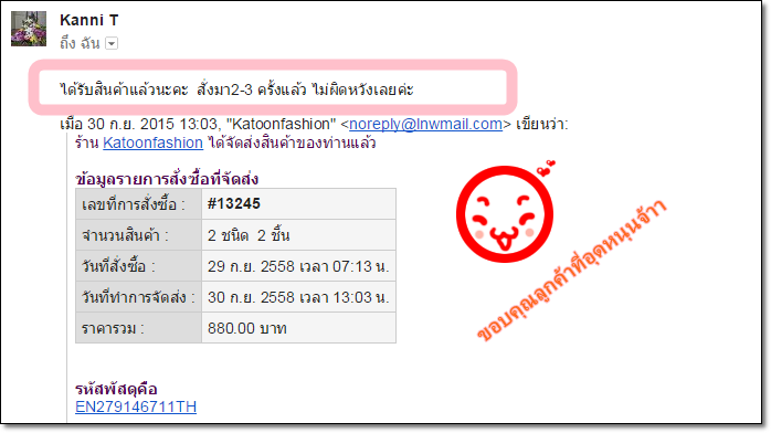 ให้ท่านอื่นๆใด้เชื่อมั่นในการสั่งสินค้าออนไลน์กับเรานะคะ